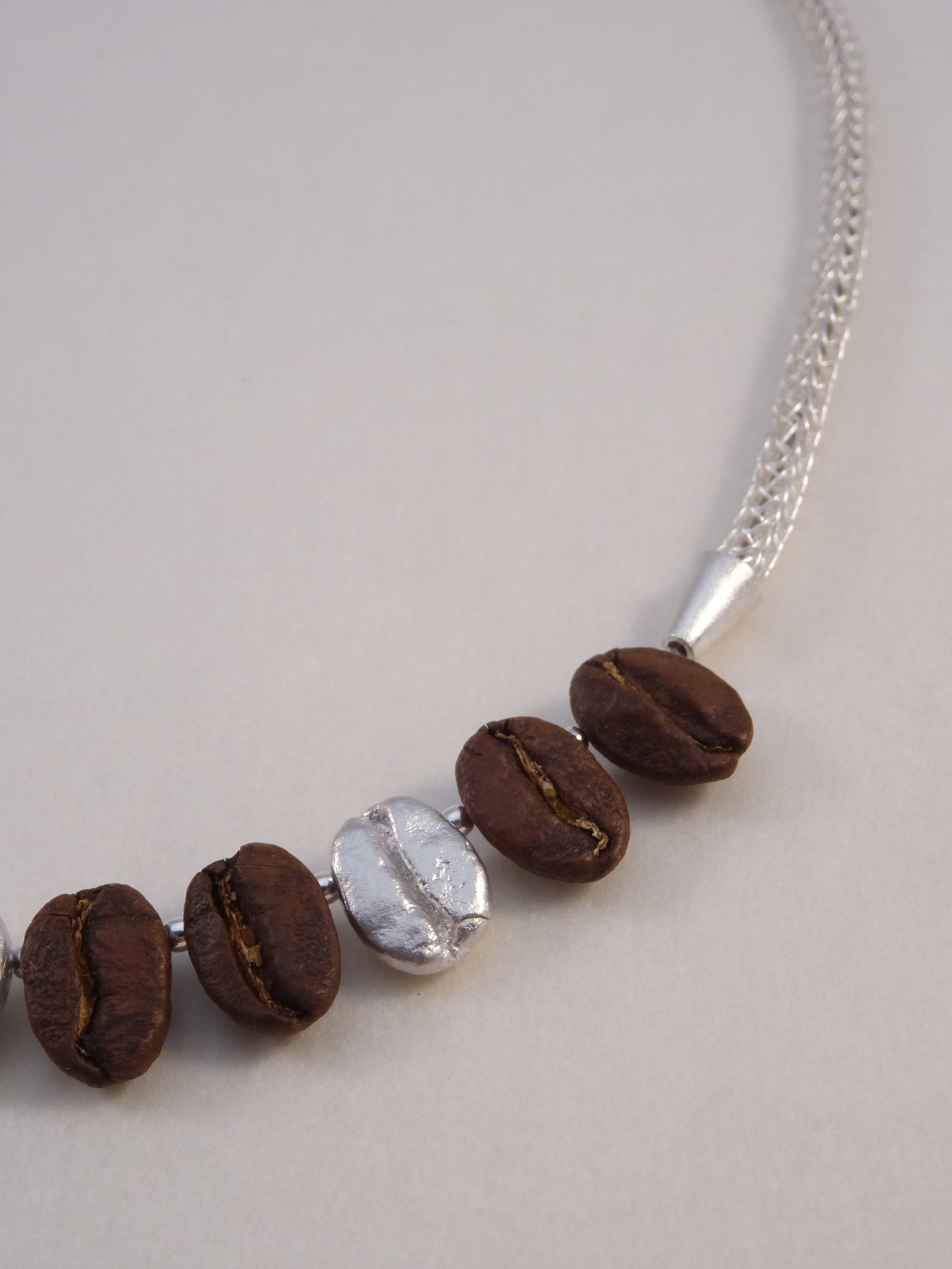Unter Verwendung von echten Kaffeebohnen der Rösterei Reinholz aus Fulda sowie Kaffeebohnen aus massivem Silber, in Kombination mit Edelsteinen, Perlen und Silber haben wir eine kleine Kollektion an Kaffeebohnenschmuck kreiert.